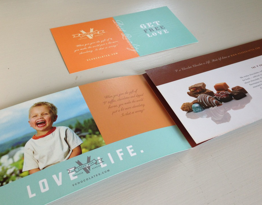 Catalog and coupon design for V Chocolates, an artisan confectioner.